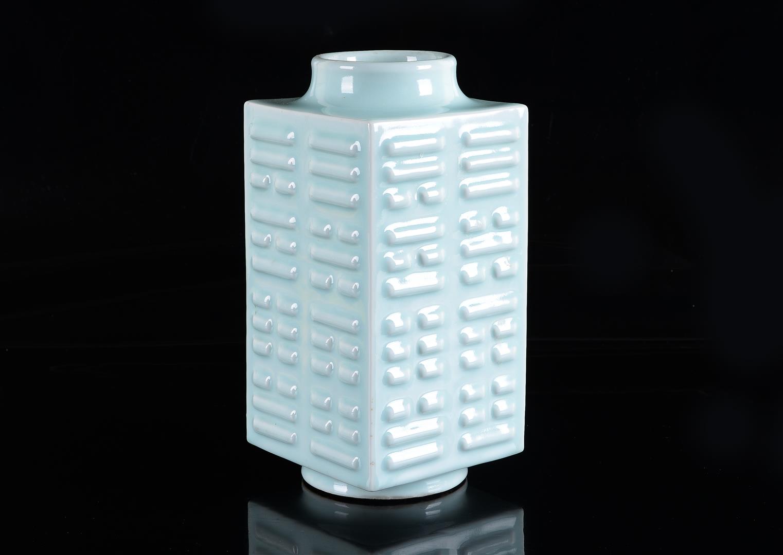1132 A celadon vase, with two cartouches decorated with mountainous landscape,