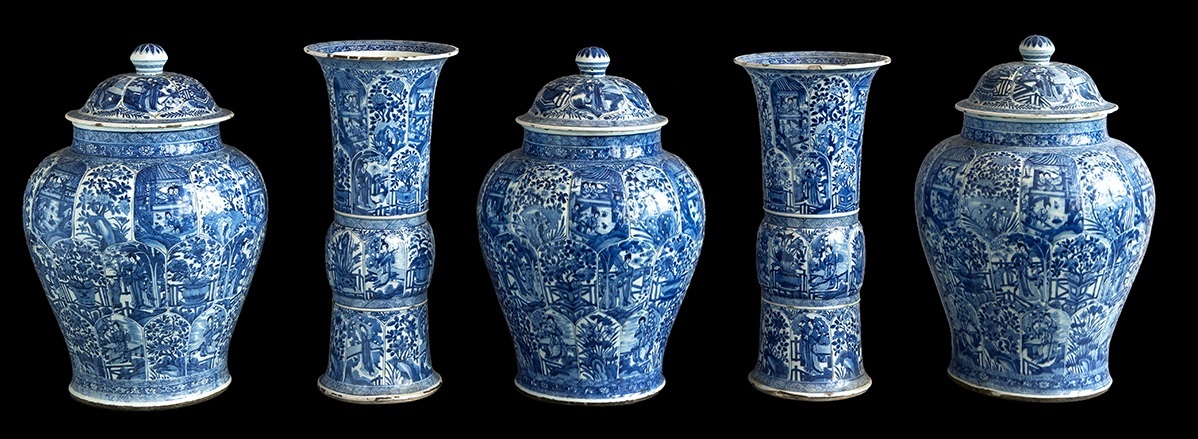 70 A five-piece blue and white porcelain garniture decorated with figures in different scenes