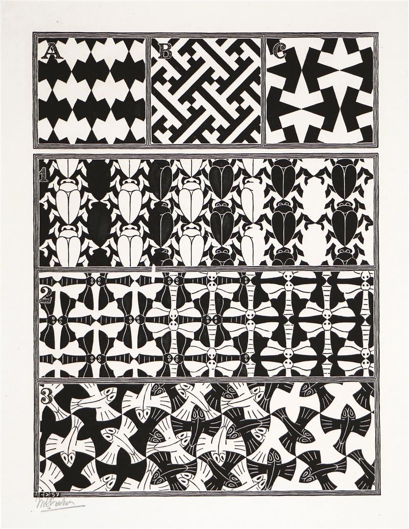 Estimate: € 3000 – 4000Lot 384:'Regular division of the plane II', signed l.l., 1957, woodcut. Printed by the Eenhoorn Pers on Eenhoorn Pers paper with the Eenhoorn Pers blind stamp. Version in black/white.