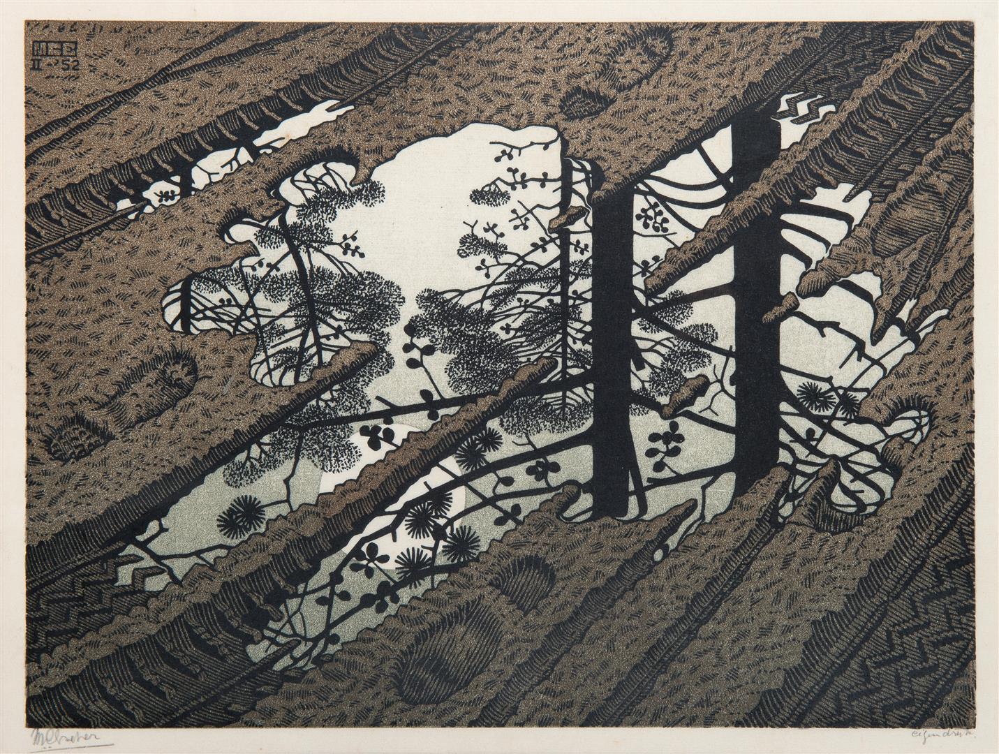 Lot 378:'Puddle', signed l.l., 'eigen druk' l.r., February 1952, woodcut in color.