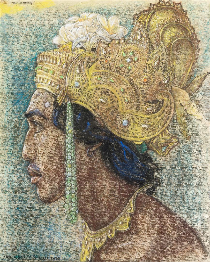 Made only three years before he passed away, Bonnet was still able, 80 years old, to portray the elegance and contemplative mood of this Balinese Arja dancer. There are typical draughtsman’s skills in this work that make it a ‘true Bonnet’: the texture of large crayon colour surfaces, typically quite rough in Bonnet’s 1970’s work, the striking use of blue to emphasize the Balinese glossy raven hair, and the many frangipani flowers that are rendered in such a realistic manner. But, most importantly, Bonnet’s mastery of this en profile portrait, that still looks three-dimensional, and his way of visualizing materials, textures, and anatomy, is unsurpassed.