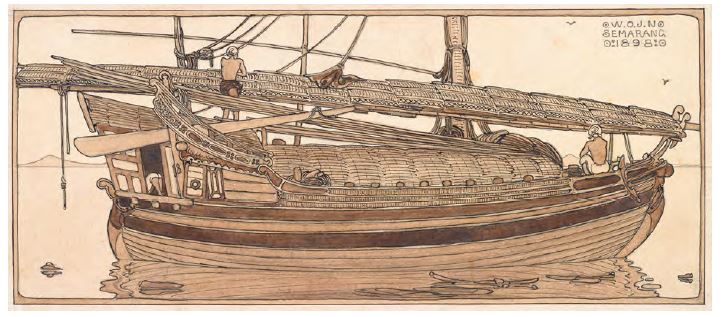 When Nieuwenkamp travelled to Java in 1898, he made drawings of ships and local boats as Rouffaer had asked him to do. These drawings were made for the new Encyclopedia of the Dutch Indies, for which Rouffaer was writing the texts. However, these ship-drawings were never published in that book. The reason for that might be that Rouffaer became sick and could not work so much.Nieuwenkamp made a pen-drawing of the same boat in 1898, and a woodcut (a detail of the boat) in August 1903 (2). The current lot is dated 1898 (when he saw the boat), but probably made a few years later (around 1904, after his first visit to Bali). Stylistically, this coloured drawing is similar to his early Balinese period. The present lot is one of the few known coloured drawings of ships.