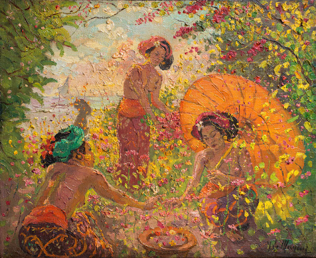Lot 80 in this auction, another oil by Le Mayeur is quite comparable, in the sense that the same three women are featured, in a similar composition of the standing woman with orange wrong directing the
