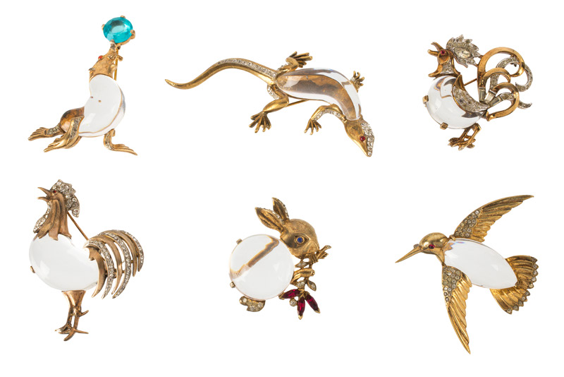 1780 A Group of six Trifari ‘Jelly Belly’goldtone brooches, depicting animals, set with multicolor stones. All signed Trifari. 4,5 – 9,5 cm. Hammerprice: € 1.200