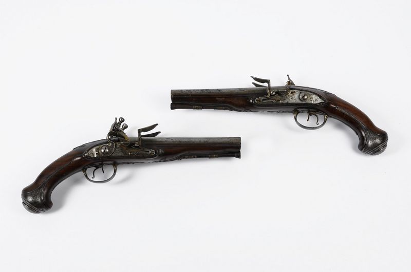 1302 Eén koppel juxtaposé dubbelloops vuursteen pistolen, gesigneerd in goud op de loopbiezen ‘Chateau Paris’. € 3.800