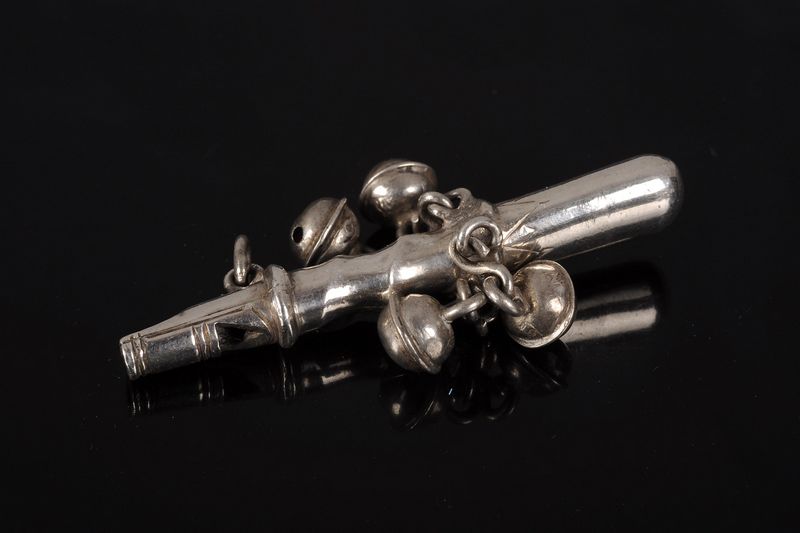 2020 Zilveren miniatuur rammelaar en fluitje. Belletjes gekeurd Utrecht, 18e eeuw. L. 6 cm . Gew. ca. 12,9 gr. € 3.200