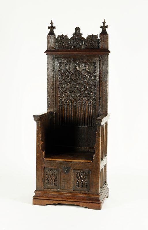 7023 Eikenhouten zitkist, Gotiek, Vlaanderen, 16e eeuw. HxBxD: 185 x 68 x 51 cm . Reconstructies. € 3.200